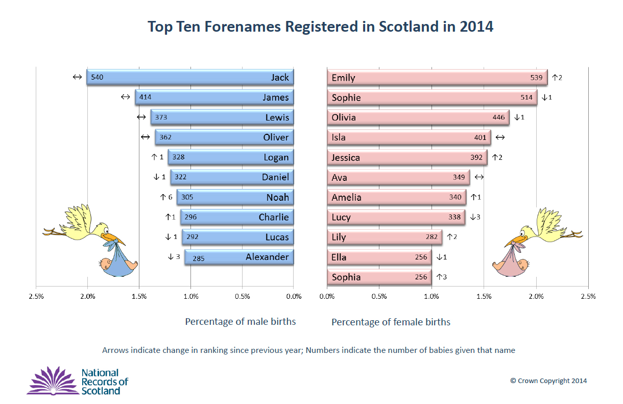 Jack and Emily were the most popular first forenames for babies whose births were registered in 2014, National Records of Scotland (NRS) announced today. Jack was the top boys’ name for a seventh consecutive year, and Emily rose from third to replace Sophie as the most popular girls’ name.